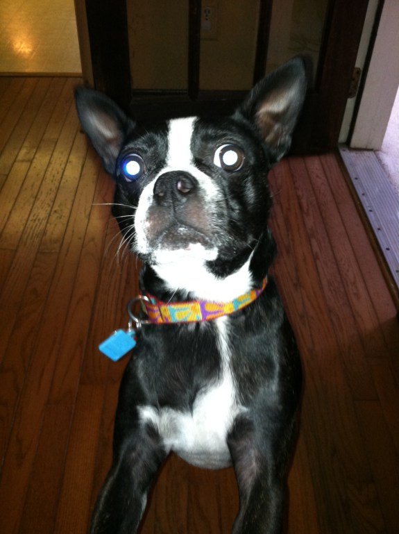 Here’s another photo from a few minutes ago, where he’s jumping up on my leg. Please notice his magic eyes and stylin’ Hawaiian collar. Murphy is all about style, though he doesn’t impose his preferences on me: