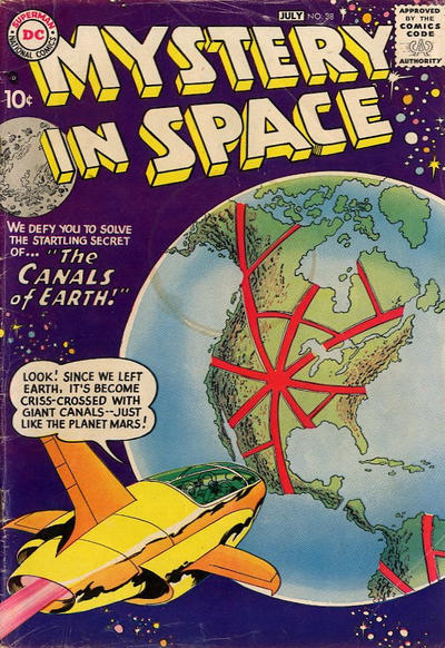 One of the leitmotivs of DC-comics covers, along with purple gorillas, Jimmy Olsen turning into something weird and Lois Lane in trouble, was perils to Earth. In the Mystery in Space books, editor Schwartz took this to a high level in the early days of the series. For pre- and early-teen American boys, this had resonance: we were just beginning the American space program, and who knew whether this might set off some trip-wire arranged long ago by aliens? It was worth staying up at night to worry about!!! Also, and even more unsettling, these covers indicated that it was the Northern hemisphere that these evil aliens were focusing on. They could care less about Europe, Asia, Africa; their eyes were on the U.S.A!!!