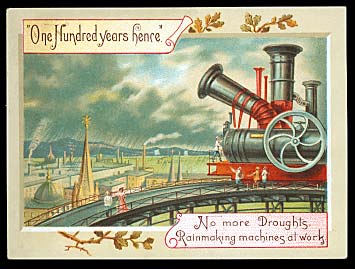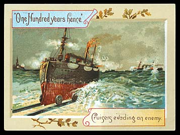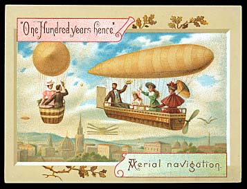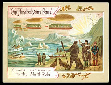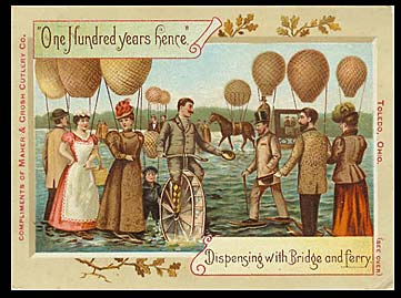 The trade cards shown are a set of 12 stock cards that predict what things will be like in the year 2000. This set was most likely produced at the Kuntsdruck-Friedberg printing plant in Berlin, Germany, and is found in both American and European versions. The images are identical for both versions, but the American cards are in English and have wider and more decorative borders. The European cards were imprinted for chocolate companies in Germany and Belgium, and the English language cards were imprinted for at least 14 different American companies. [These two paragraphs are based on the article “One Hundred Years Hence” by Richard Sheaff appearing in the Winter, 1999, issue of “The Advertising Trade Card Quarterly” published by The Trade Card Collector’s Association].