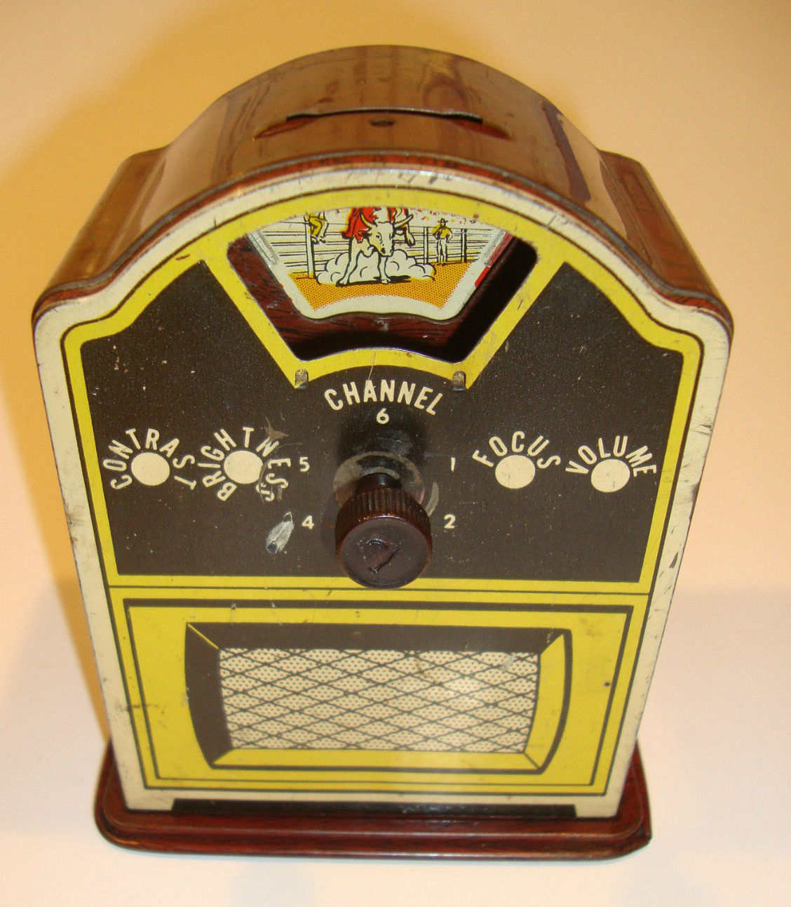 This TV bank shows an oddly blasé Howdy Doody, who was a hugely popular marionette from those times. This appears to be one of those ceramic banks that you had to smash to get your coins. I didn’t like that concept: