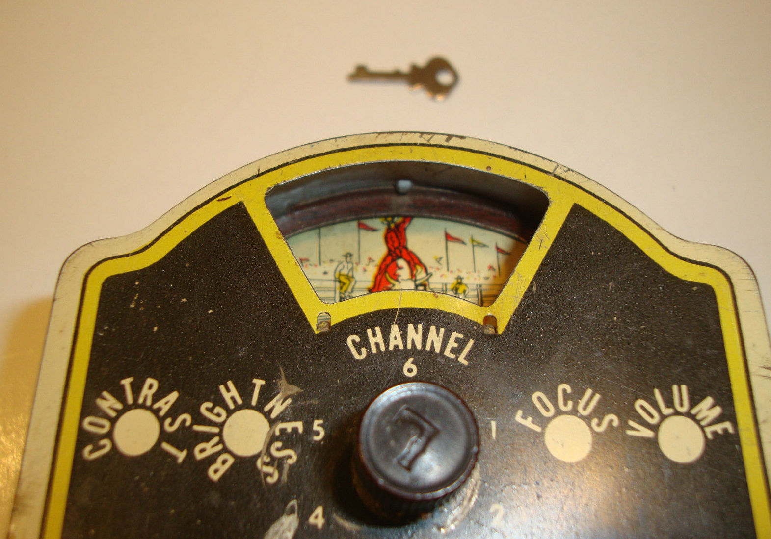 Our last TV bank looks to me as though it’s a repurposed radio bank, with a black-and-white paper photo pasted over the radio dial to make it look like a TV: