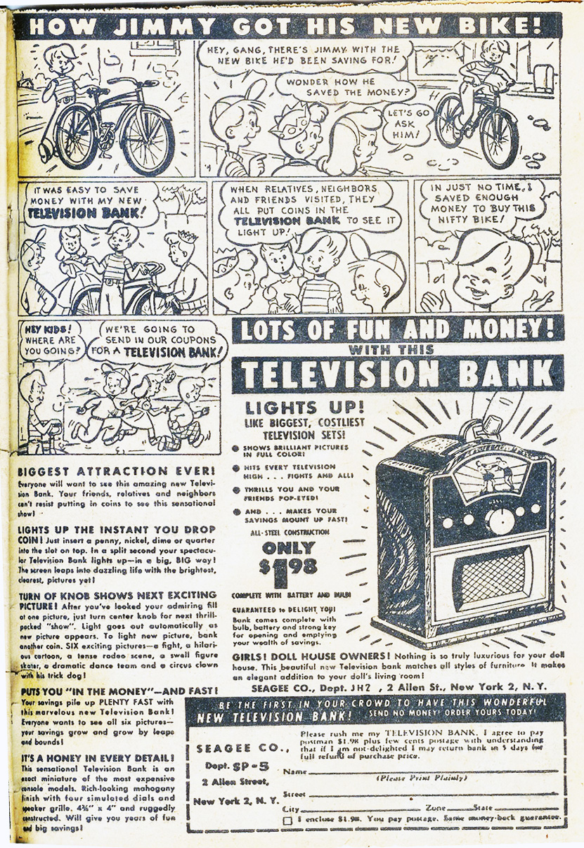 The above ad ran in small-publisher comic books in the early 1950s, when TV was the new amazing thing. After decades of getting their mass-market entertainment from movies and radio, TV was just astonishing to most Americans. The shows broadcast in those days were primitive by our standards, but hey; the novelty of the medium trumped finesse in execution.