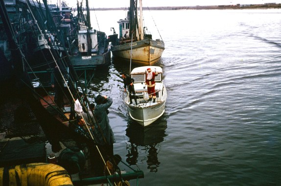 So these were taken in Pascagoula, Mississippi in 1958. I was in the first grade. The Christmas Festival that year was a big deal for me, because my dad flew Santa onto the river with his float plane, and a little boat picked Santa up from my dad’s plane and brought him to the docks. Mr. John Quinn, my dad’s friend who owned the menhaden plant mentioned earlier, lifted me up onto a 55-gallon drum because I was little. Mr. Quinn is in the dark-blue-black-and-white checked shirt in the second photo, and his wife, Jane, is standing next to him in a red-and-black checked shirt. Here comes Santa on the small boat.
