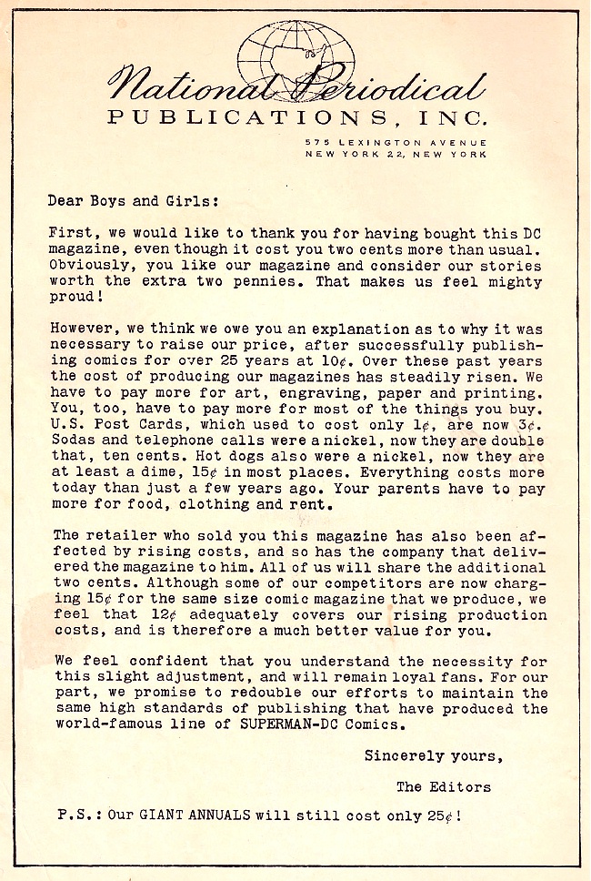 For me, whose interest in primarily in the marketing and print-production aspects of the comic books, a fascinating discovery was the cover/sales chart sheets kept by Irwin Donenfeld, Irwin was the son of DC co-founder Harry Donenfeld, and was co-owner, editorial director and vice-president of DC from about 1948 to 1968. These hand-drawn charts showed the covers of each DC comic by month, with notations of the size of the print run and percentage of copies sold written under each cover.