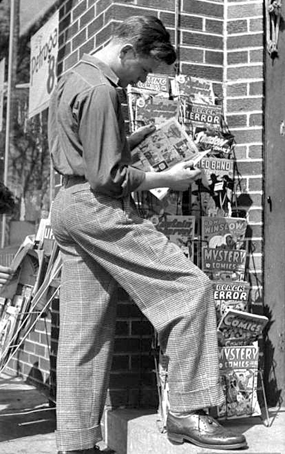 A precursor of The Office’s Jim Halpert looks at comics on sale. Oddly enough, not one DC comic on this rack. Based on the cover of Don Winslow of the Navy #26 and Red Band Comics #4 or 5 (both used the same art!), this was taken in March of 1945.
