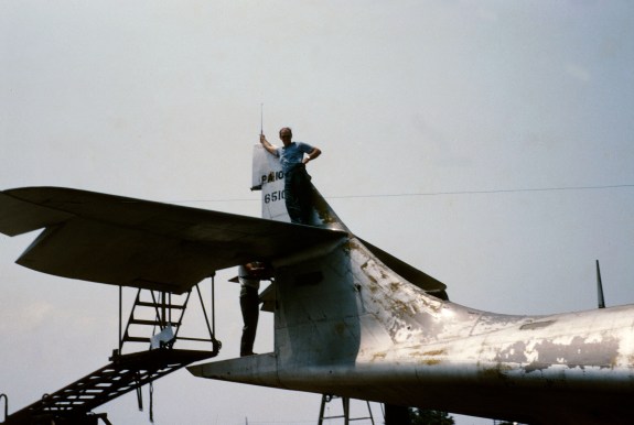 These planes are large; the photo doesn’t convey a sense of scale. The lovely blue-and-white plane also shown is a Piaggio P-136-L1 seaplane, and it isn’t small. I’m willing to bet Dad was there trying to buy that smaller plane when he took the photo.