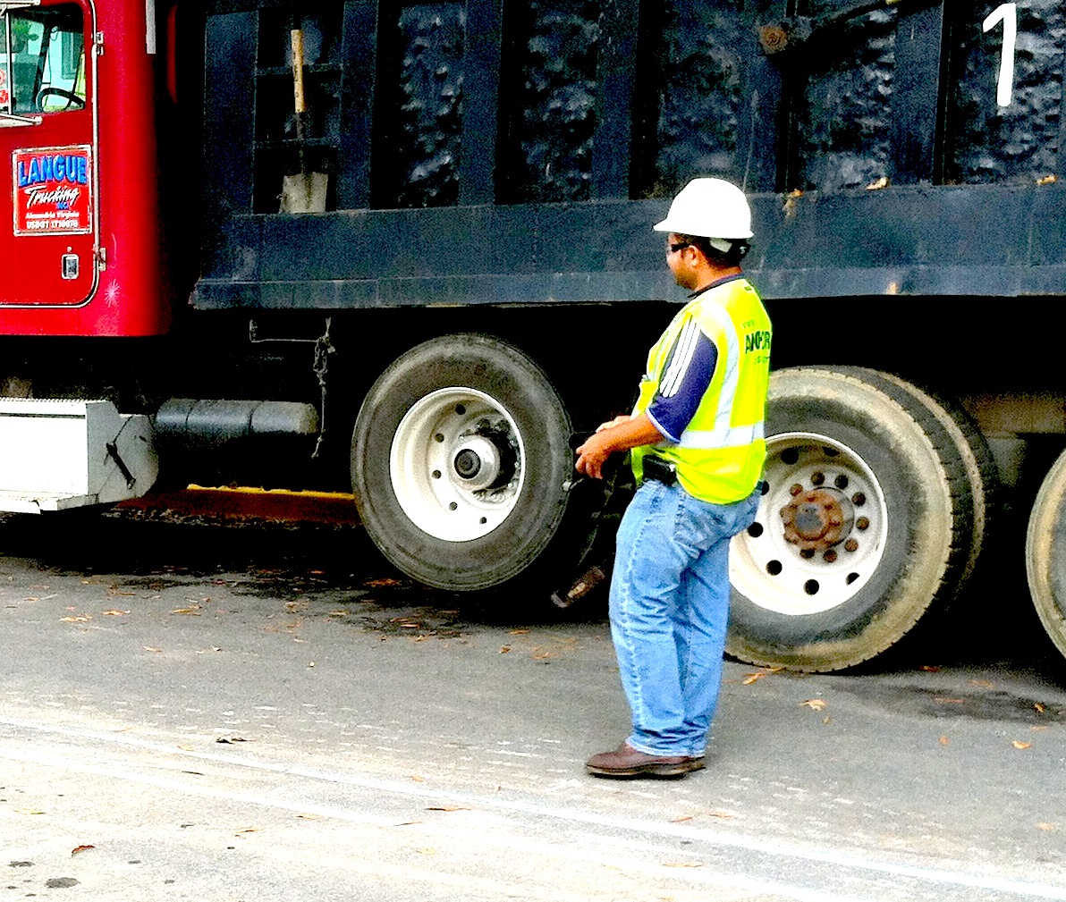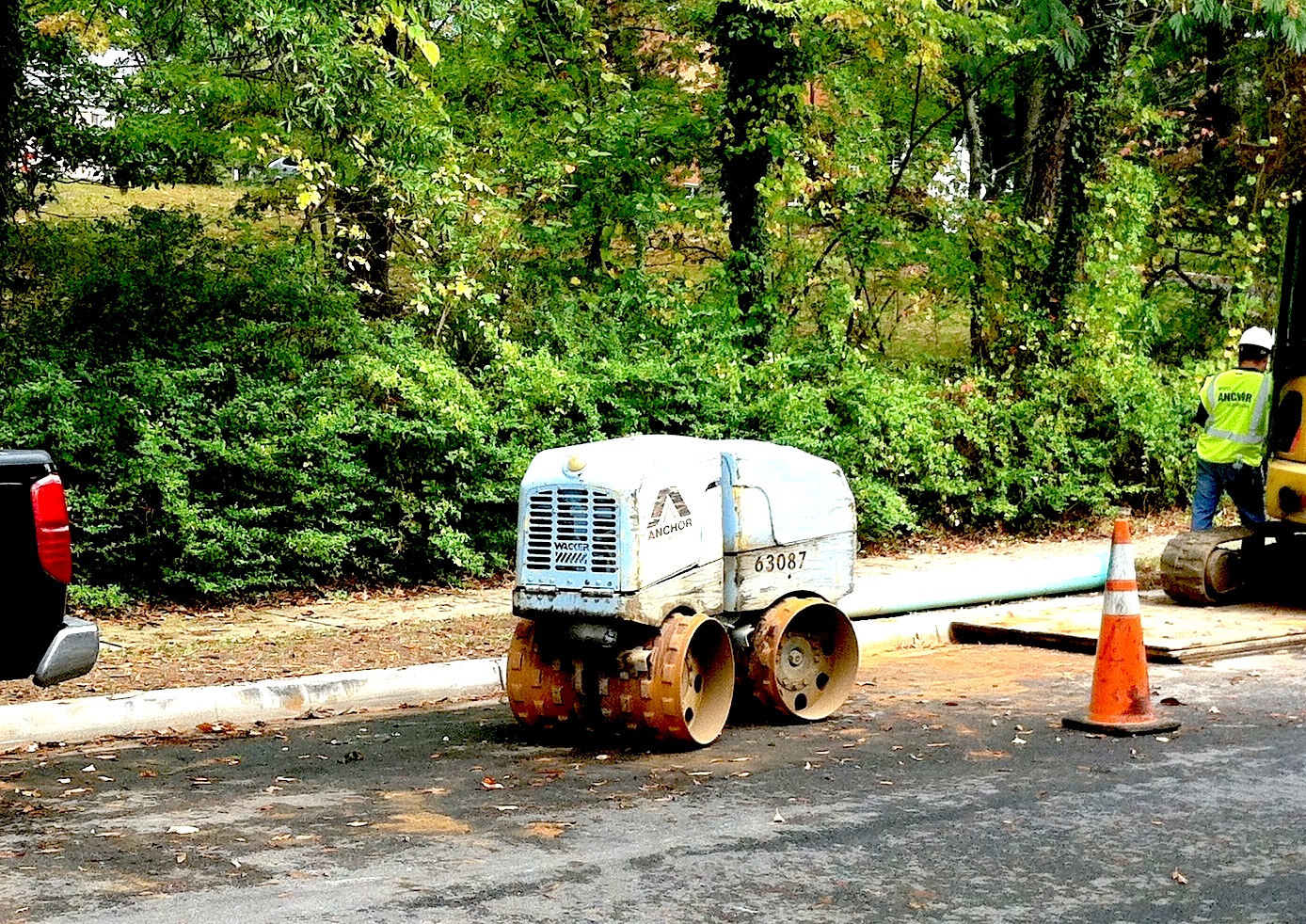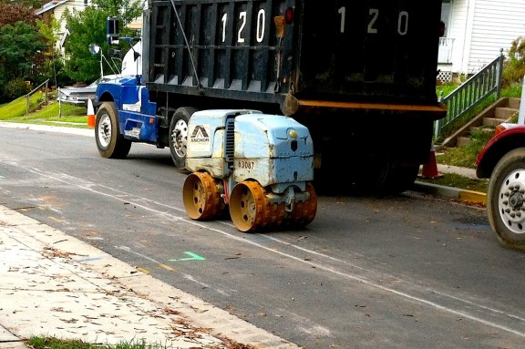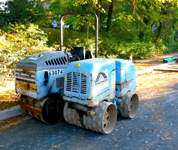 Having put in spanking-new sewer-feeder pipes, which required tearing up the street that had been newly paved two years ago, the WSSC’s contractors are hard at work today. They’ve replaced a lot of the concrete curbing that had been damaged in the last two months. They’re replacing driveway aprons that were messed up (including ours). They plan, by the end of the week, to have a newly paved street for us, curb to curb, as they put it.
